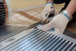 4. Укладання нагрівальної плівки вимагає попередньої підготовки підлоги. Треба підмести підлогу в приміщення і укласти теплоізоляцію . Далі, слід розрізати інфрачервону плівку по зазначених місцях розрізу, викласти на теплоізоляцію і зафіксувати за допомогою звичайного клейкого скотча.